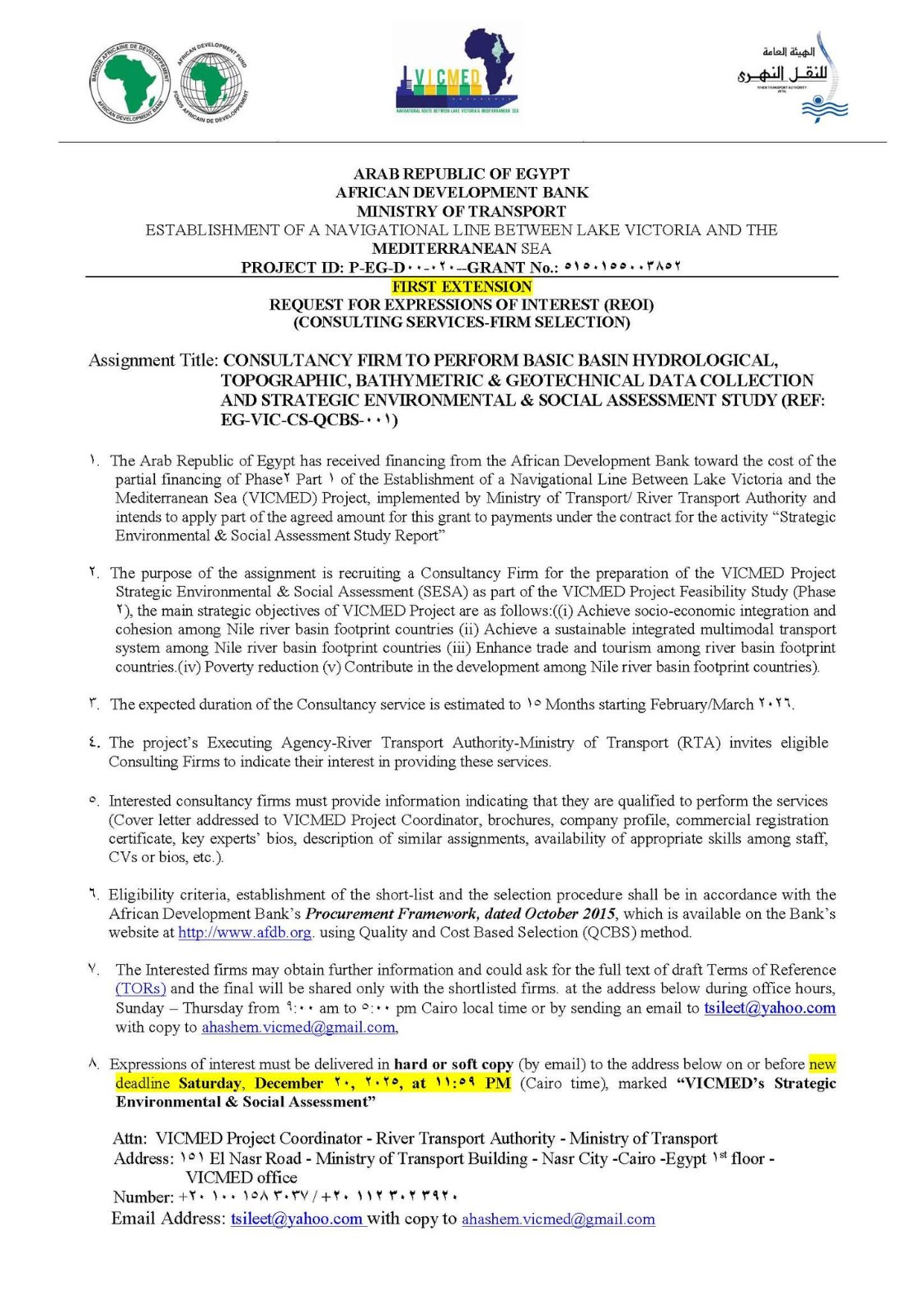 حصلت جمهورية مصر العربية على تمويل من بنك التنمية الإفريقي لتكلفة التمويل الجزئي للمرحلة الثانية الجزء الأول من إنشاء خط ملاحي بين بحيرة فيكتوريا والبحر المتوسط (VICMED) الذي تنفذه وزارة النقل، هيئة النقل النهري وتعتزم تخصيص جزء من المبلغ المتفق عليه لهذه المنحة على المدفوعات بموجب العقد لنشاط "تقرير دراسة التقييم البيئي والاجتماعي الاستراتيجي".