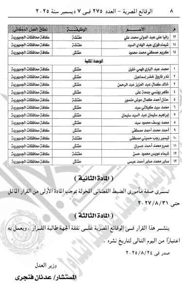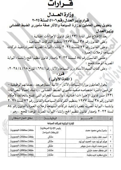 كما جاء ذلك بناء على القانون رقم 84 لسنة 2022 بإصدار قانون تنظيم الحج وإنشاء البوابة المصرية الموحدة للحج ؛ وعلى كتاب وزير السياحة والآثار رقم (694) المؤرخ 18/4/2025؛ قرر : ( المادة الأولى ) يُخول العاملون بوزارة السياحة والآثار المرفق أسماؤهم بعد ، بصفاتهم الوظيفية - كل فى دائرة اختصاصه صفة مأموري الضبط القضائي.