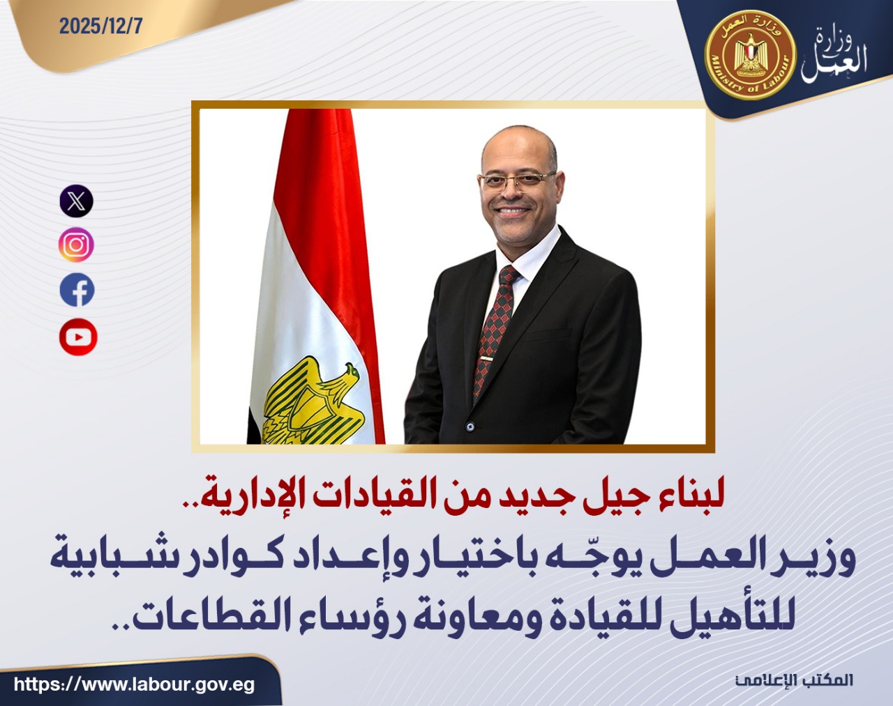 وجّه وزير العمل محمد جبران، بإطلاق برنامج شامل لاختيار وإعداد كوادر شبابية مؤهلة لتولي مسئوليات قيادية ومعاونة رؤساء القطاعات بالديوان العام للوزارة ومديريات العمل بالمحافظات.