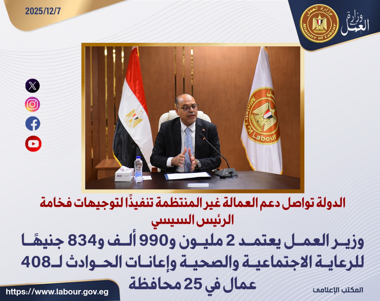 وأكد وزير العمل أن الوزارة مستمرة في تقديم كافة أوجه الدعم والرعاية للعمالة غير المنتظمة بجميع المحافظات تنفيذًا لتوجيهات الرئيس عبدالفتاح السيسي، موضحًا أن هذه المساعدات تأتي في إطار التزام الدولة بتوفير حياة كريمة لضمان الاستقرار الاجتماعي للأسر الأكثر احتياجًا، و توسيع مظلة الحماية الاجتماعية لتشمل كل من يستحق.