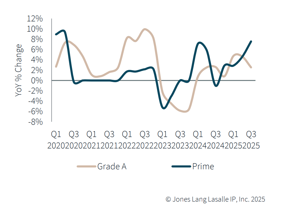 يوضح الرسم البياني السابق تغير أسعار إيجارات المكاتب على أساس سنوي للفئتين الرئيسيتين في السوق، وهم فئة Prime وفئة Grade A، في الفترة من عام 2020 إلى عام 2025.