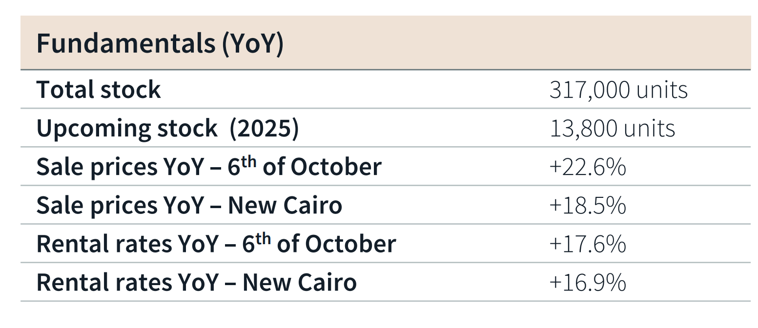ويلاحظ أيضًا، أن الأسعار انهارت مع بداية 2023، بسبب ارتفاع التضخم وتعويم الجنيه المصري، ولكن مع بداية عام 2024، بدأ السوق في التعافي ثم انخفضت الأسعار خلال نفس السنة، حتى بدأ عام 2025، الذي سجل السوق نمو ملحوظ في الأسعار، ففي الربع الأول من 2025، ارتفعت الأسعار بنسبة 4%، حتى سجلت في الربع الثالث 7.6%.