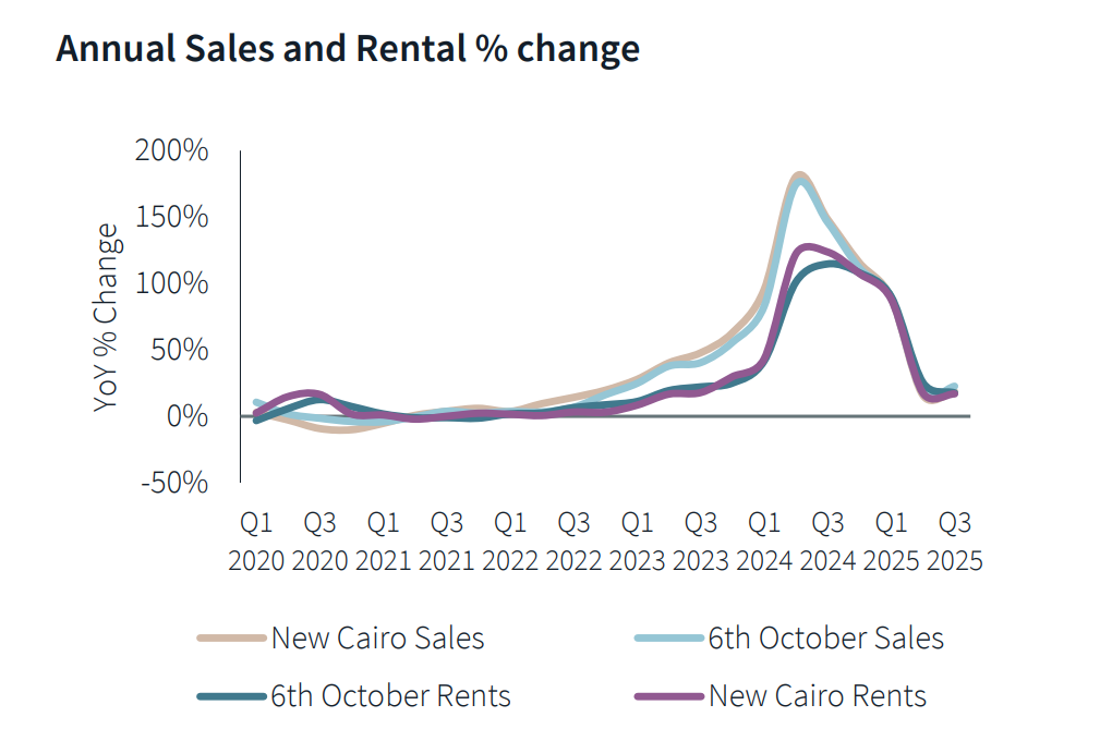 وخلال عام 2025، بدأت النسب تقل في المنطقتين، ولكن في المجمل، فإن منطقة 6 أكتوبر تعتبر أكثر تقلبًا في المبيعات على عكس القاهرة الجديدة، التي تميزت باستقرار نسبي، ولكن الإيجارات في كلا المنطقتين سجلا نموًا مستمرًا مقارنة بالمبيعات.