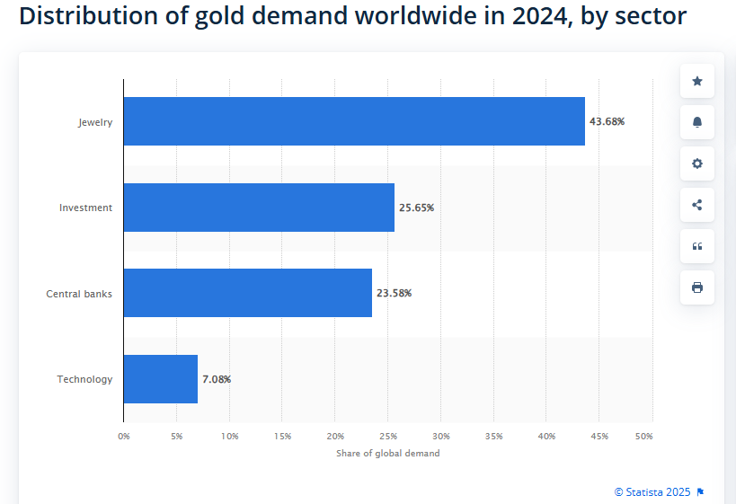 رغم التضخم واضطرابات الأسواق، حافظ قطاع المجوهرات على مكانته كأكبر مستهلك للذهب عالميًا بحصة 43.68%، أي حوالي 2000 طن كانوا لصناعة الحُلي فقط في 2024 بحسب Statista.
