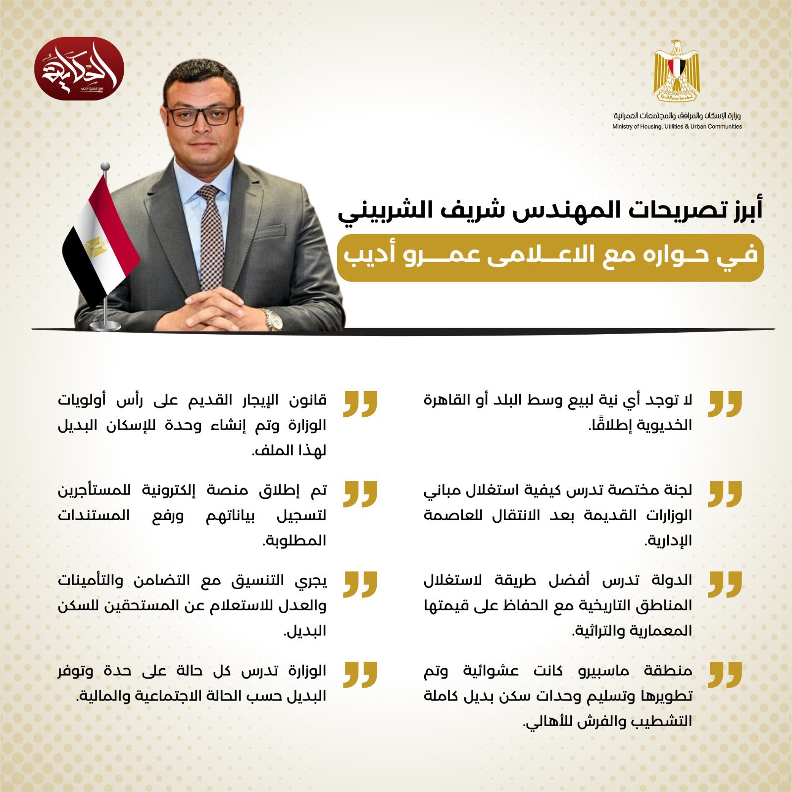 وألقت وزارة الإسكان الضوء على التصريحات التلفزيونية للمهندس شريف الشربيني وزير الإسكان، خلال حلوله ضيفا على أحد البرامج.
