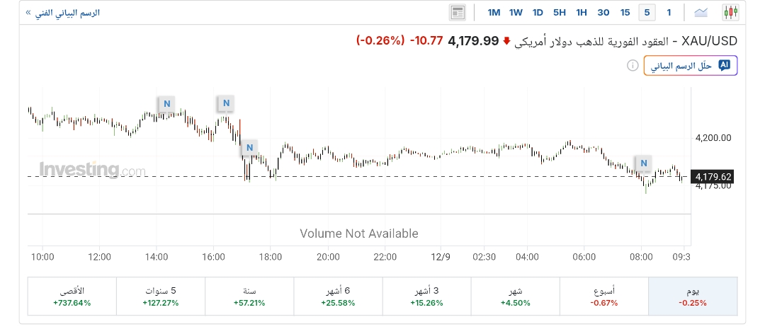 وارتفعت الأسعار الفورية للذهب بنسبة 0.2%، لتتداول حاليًا عند 4,179 دولارًا للأوقية، بعدما افتتحت التداولات عند 4,190 دولارًا، مسجلة أعلى مستوى لها عند 4,198 دولار، وأدنى مستوى عند 4,170 دولارًا، بحسب تقرير موقع «إنفيستينج»، ولامست عوائد سندات الخزانة الأمريكية القياسية لأجل 10 سنوات أعلى مستوى لها في شهرين ونصف الشهر أمس الاثنين.