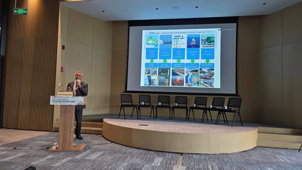 وتناول العرض جهود الهيئة في تحقيق الاستدامة البيئية عبر خفض الانبعاثات، ورفع كفاءة الطاقة، وتعزيز القدرة على مواجهة المخاطر المناخية، إضافة إلى تنفيذ مشروعات متقدمة في إدارة الموارد المائية والنفايات بما ينسجم مع متطلبات الموانئ الخضراء عالميًا.