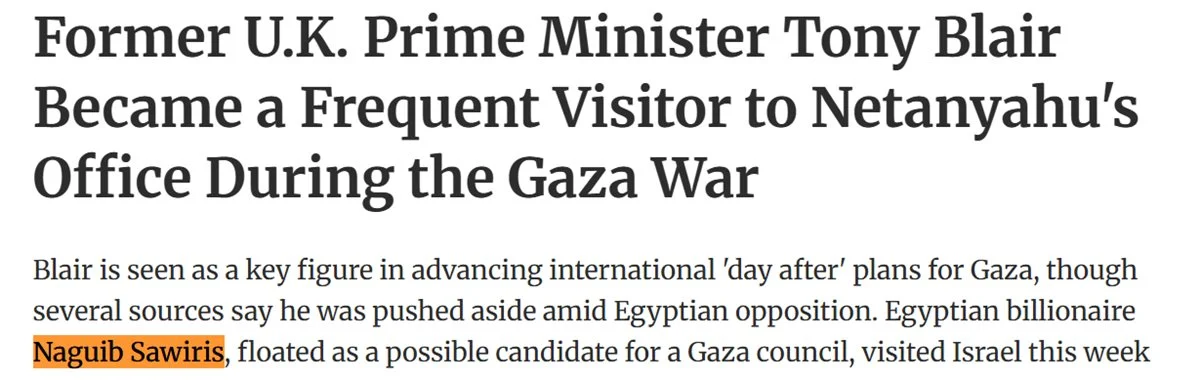 نشرت صحف إسرائيلية تقارير زعمت فيها قيام رجل الأعمال المصري نجيب ساويرس بزيارة لتل أبيب، بعد طرح اسمه كمرشح لخلافة توني بلير في الهيئة الاستشارية التي من المفترض أن تدير الإعمار في قطاع غزة.