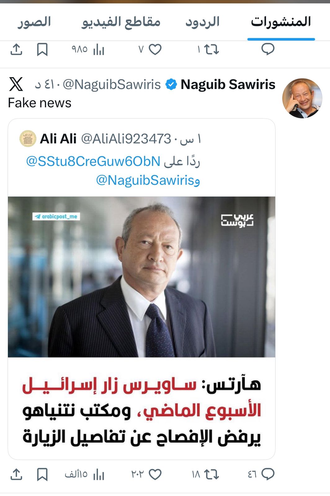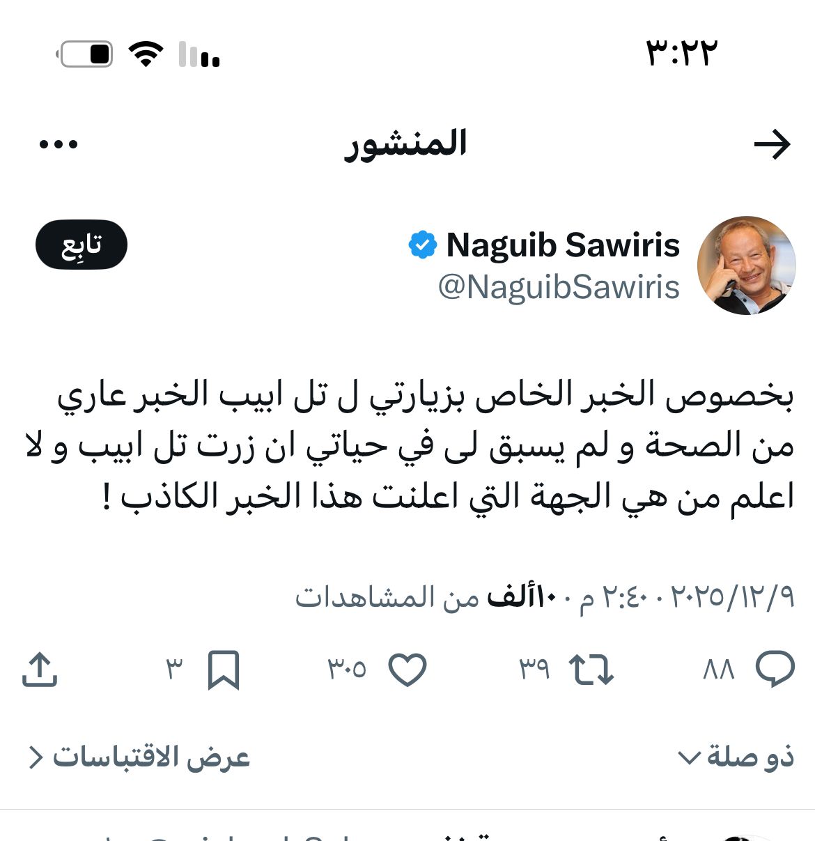 نفى رجل الأعمال نجيب ساويرس الأخبار التي تداولتها صحف إسرائيلية بزيارته لتل أبيب خلال الأيام الماضية، وقال في تدوينة له على صفحته بموقع التواصل الاجتماعي "إكس": بخصوص الخبر الخاص بزيارتي لـ تل أبيب، الخبر عارٍ من الصحة، ولم يسبق لي في حياتي أن زرت تل أبيب، ولا أعلم من هي الجهة التي أعلنت هذا الخبر الكاذب".