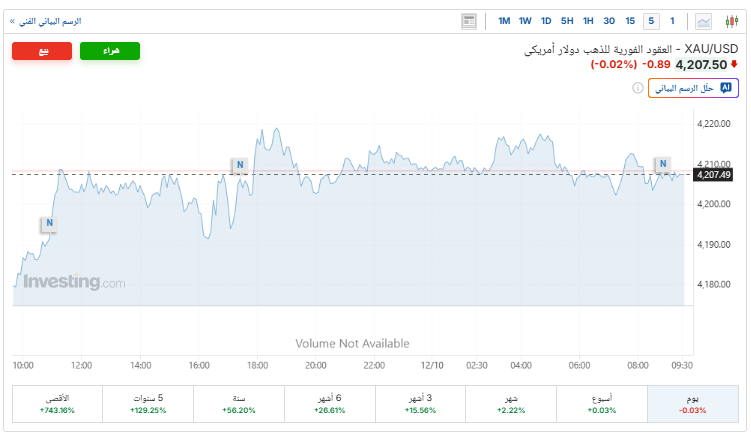 واستقرت الأسعار الفورية للذهب، لتتداول حاليًا عند 4,207 دولار للأوقية، بعدما افتتحت التداولات عند 4,208 دولار، مسجلة أعلى مستوى لها عند 4,218 دولار، وأدنى مستوى عند 4,201 دولار، بحسب تقرير موقع «إنفيستينج».
