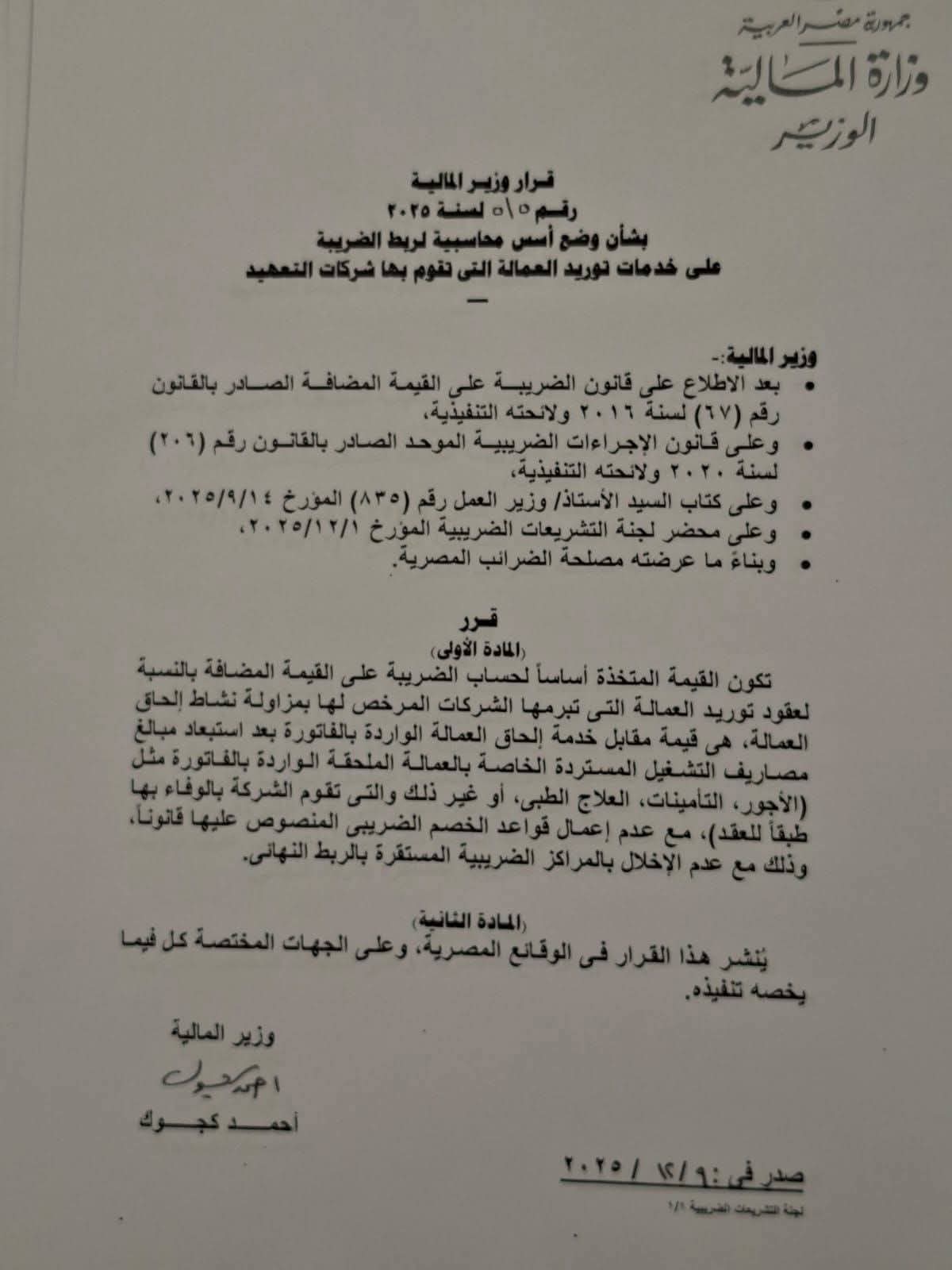 أصدرت وزارة المالية قراراً رقم 515 لسنة 2025، بشأن وضع أسس محاسبية لربط الضريبة على خدمات توريد العمالة التي تقوم بها شركات التعهيد.