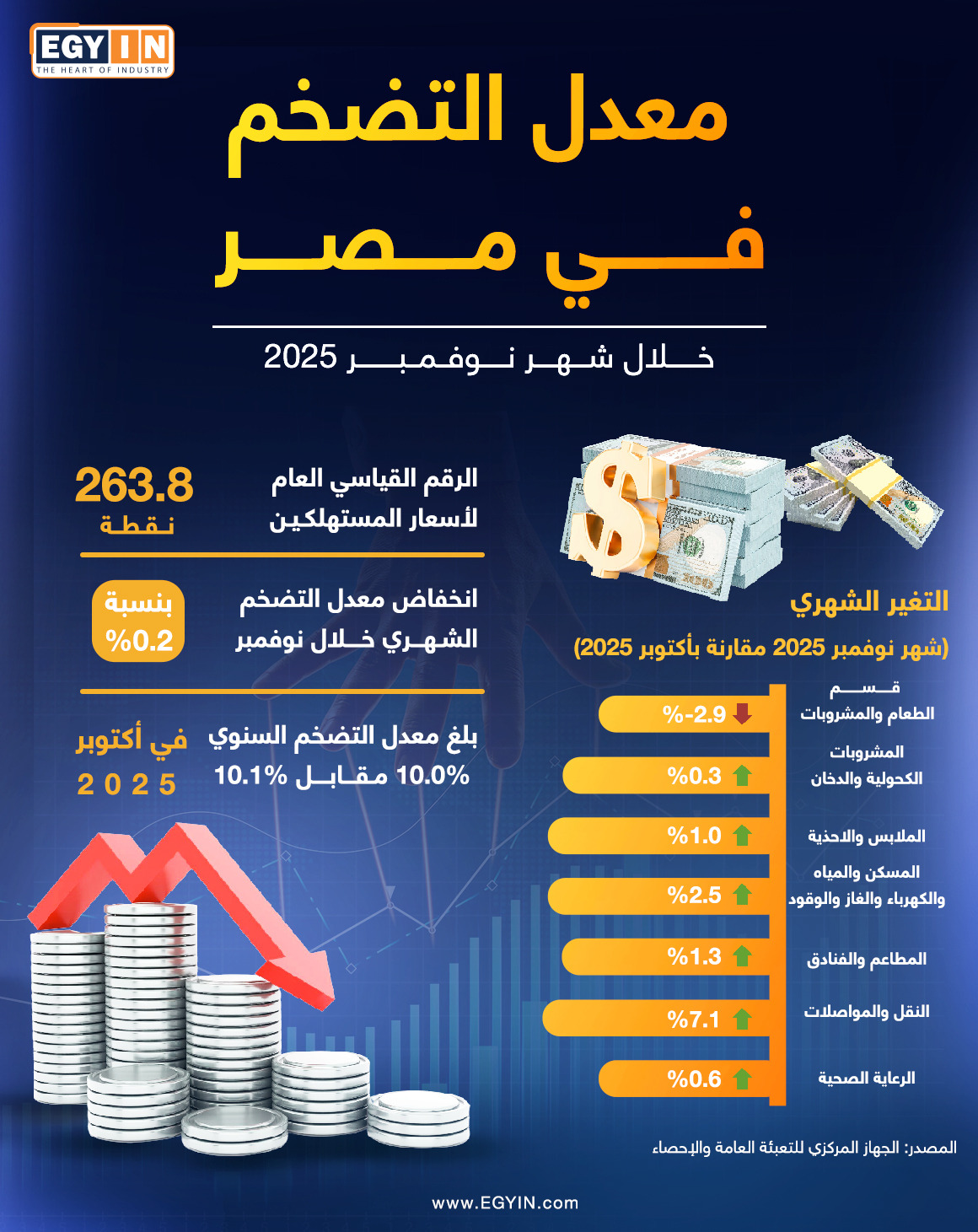 أعلن الجهاز المركزي للتعبئة العامة والإحصاء، أن الرقم القياسي العام لأسعار المستهلكين بلغ خلال شهر نوفمبر 2025 نحو 263.8 نقطة، مسجلًا انخفاضًا في معدل التضخم الشهري بنسبة -0.2% مقارنة بشهر أكتوبر 2025.