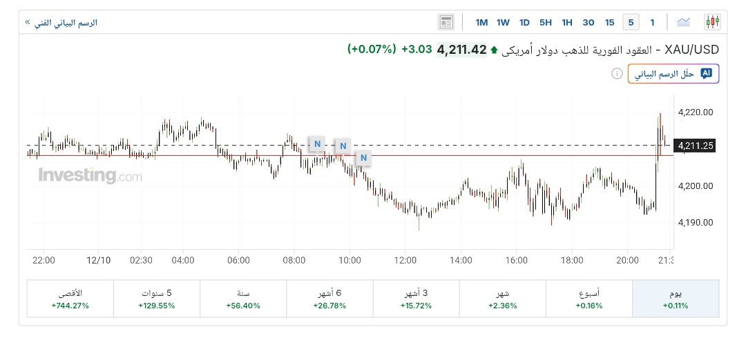 وارتفعت الأسعار الفورية للذهب، لتتداول حاليًا عند 4,211 دولار للأوقية، بعدما افتتحت التداولات عند 4,208 دولار، مسجلة أعلى مستوى لها عند 4,219 دولار، وأدنى مستوى عند 4,188 دولار، بحسب تقرير موقع «إنفيستينج».
