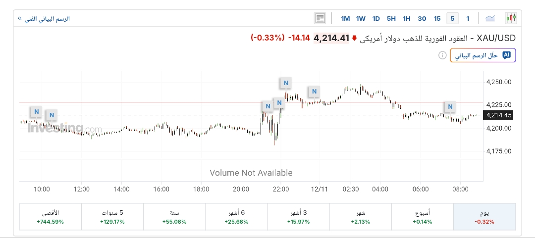 وافتتحت أونصة الذهب العالمي جلسة تداولات اليوم على تراجع طفيف بنسبة 0.3% لتتداول حاليًا عند 4,214 دولارًا للأوقية، بعد أن افتتحت تداولات اليوم عند المستوى 4228 دولار للأونصة، بحسب موقع «إنفيستينج».