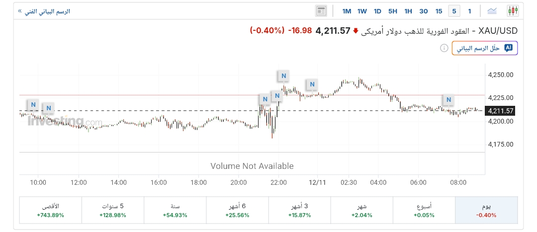وتراجعت الأسعار الفورية للذهب بنسبة 0.4%، لتتداول حاليًا عند 4,211 دولار للأوقية، بعدما افتتحت التداولات عند 4,228 دولار، مسجلة أعلى مستوى لها عند 4,247 دولار، وأدنى مستوى عند 4,204 دولار، بحسب تقرير موقع «إنفيستينج».