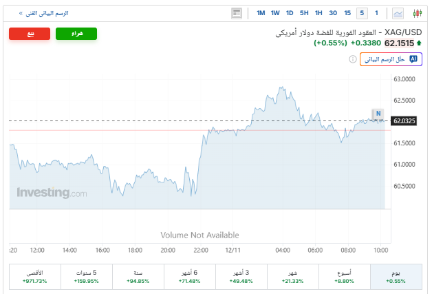 وتفوقت الفضة في الأداء، مرتفعة بشكلٍ حادٍ إلى مستوى قياسي تجاوز الـ62 دولارًا للأونصة، وسط توقعات بإمدادات أكثر شحًا، وتحسن بالطلب في العام المقبل، وفقًا لإنفستينج.