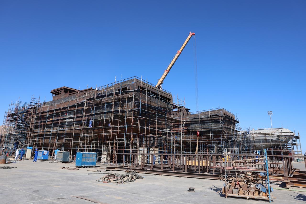 بدأت الجولة بتفقد أعمال بناء القاطرات البحرية من طراز" عزم" بساحة الترسانة، حيث يجري العمل حالياً لاستكمال أعمال بناء 8 قاطرات يتم بناؤهم على التوازي وذلك بعد تسليم القاطرتين "عزم 1" و"عزم 2" .