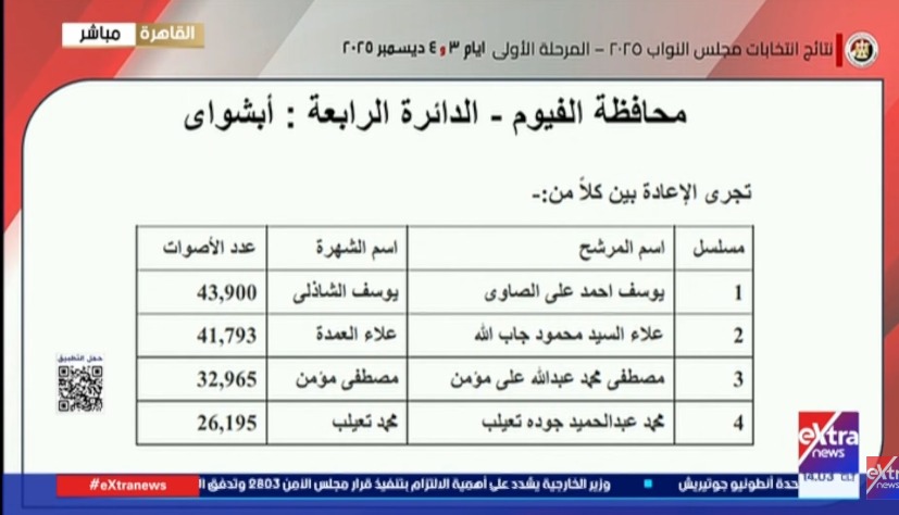 وبالنسبة للدائرة الرابعة لمحافظة الفيوم ومقرها مركز أبشواي، تجرى الإعادة بين كلًا من يوسف احمد على الصاوي، بعدد أصوات 43,900، علاء السيد محمود جاب الله، بأصوات 41,793، مصطفى محمد عبدالله على مؤمن، بأصوات 32,965، محمد عبد الحميد جوده تعيلب بعدد أصوات 26,195.