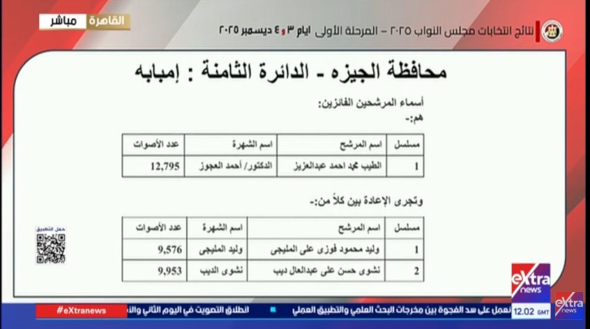 وبالنسبة للدائرة الثامنة لمحافظة الجيزة ومقرها مركز إمبابة، تجرى الإعادة بين كل من وليد محمود فوزي على المليجي، بعدد أصوات 9,576، ونشوى حسن على عبد العال ديب، بعدد أصوات 9,953.
