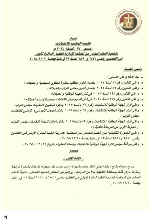 كما أعلنت الهيئة التالي اسميهما أعضاء بمجلس النواب (2025) النظام الفردي جولة الإعادة للمرحلة الأولى التي أجريت يومي الاثنين والثلاثاء الموافقين 1 و2 ديسمبر 2025 بالخارج، ويومي الأربعاء والخميس الموافقين 3 و4 ديسمبر 2025 داخل مصر، وذلك على النحو التالي: