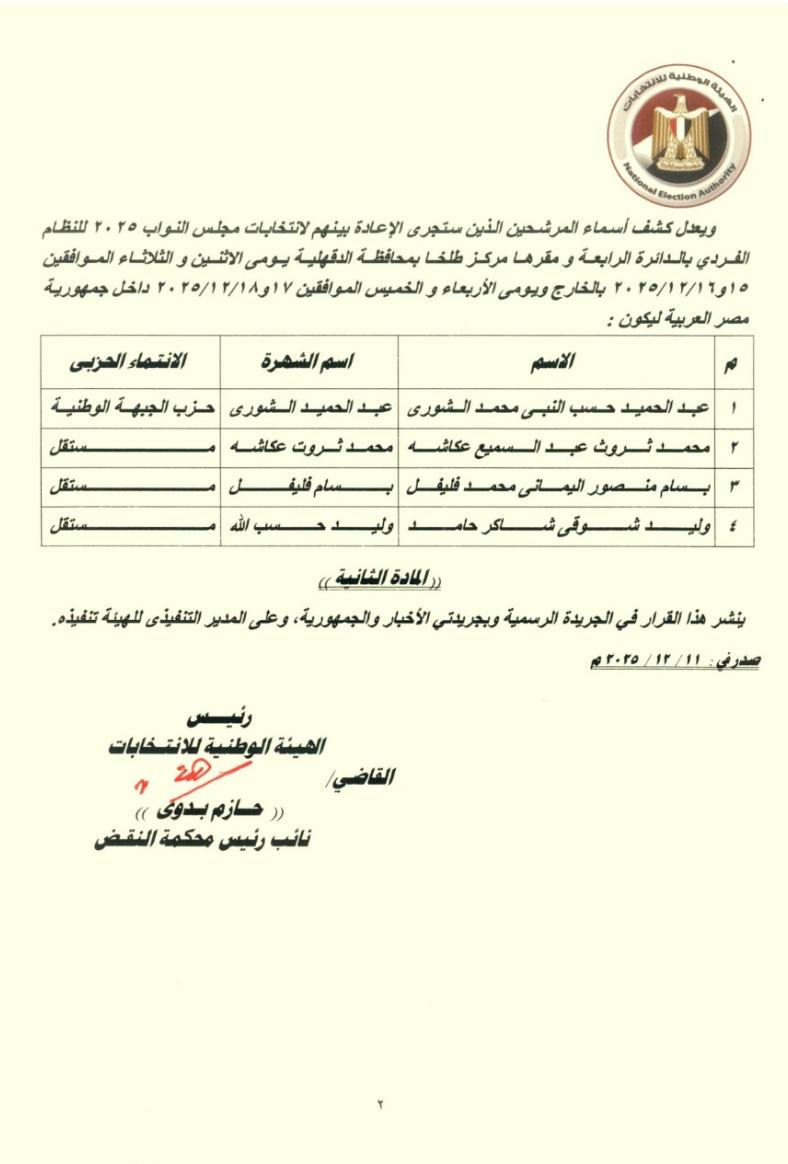 أعلنت الهيئة الوطنية للانتخابات إدراج اسم المرشح وليد شوقي شاكر حامد وشهرته (وليد حسب الله) بجولة الإعادة بالدائرة الرابعة ومقرها مركز طلخا بمحافظة الدقهلية، بدلًا من المرشح إبراهيم أبو المعاطي السعيد الفضائي، تنفيذًا للحكم الصادر من المحكمة الإدارية العليا الدائرة الأولى في الطعنين رقمي (1541 و1890) لسنة 72 قضائية عليا بجلسة 10 ديسمبر 2025.