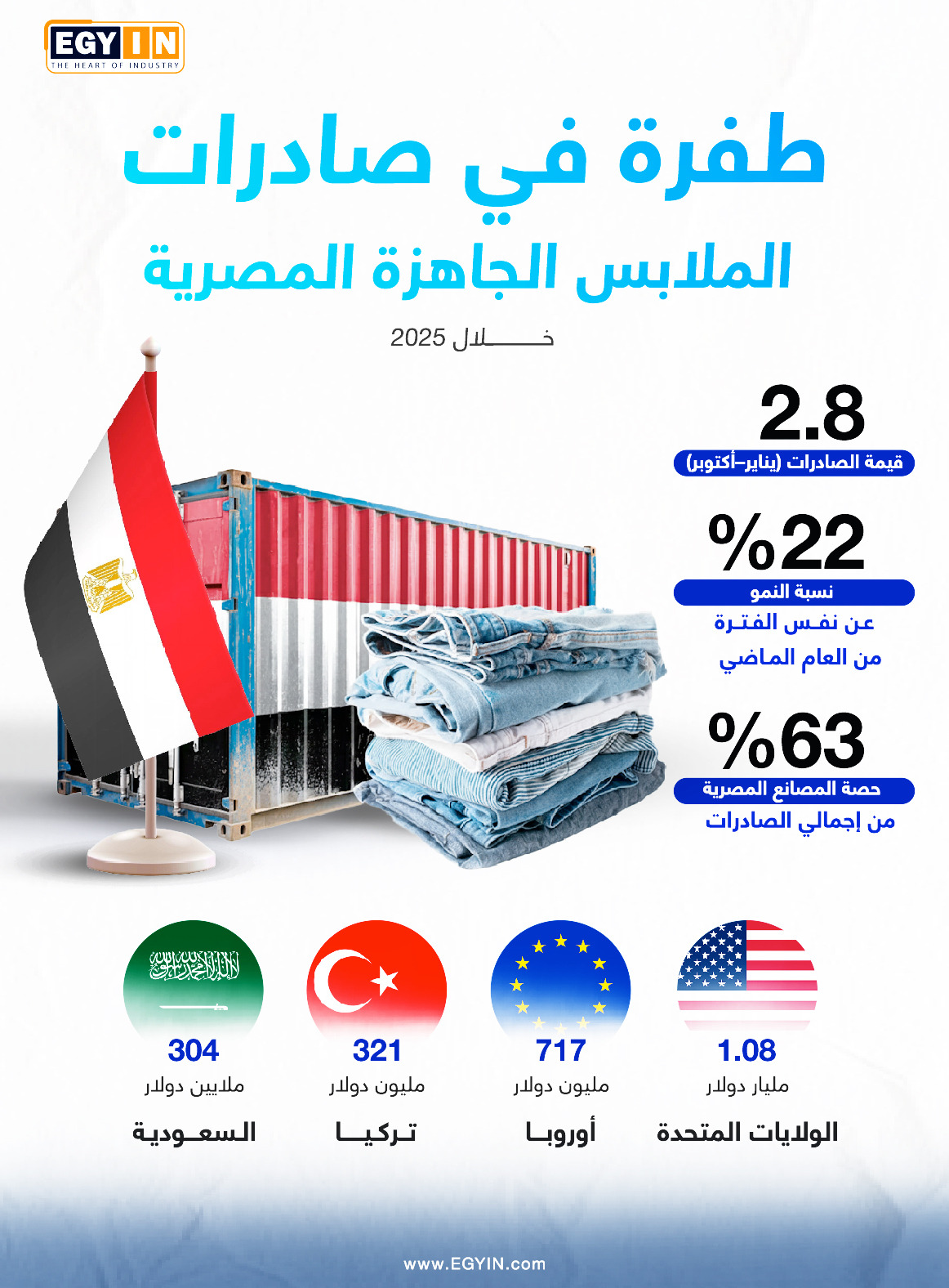 ينشر موقع "إيجي إن"، إنفوجراف يعرف فيه صادرات الملابس الجاهزة خلال عام 2025، إذ حققت صادراتها المصرية قفزة تاريخية خلال الفترة من يناير إلى أكتوبر 2025، مسجلة 2.8 مليار دولار بنمو 22%، مقارنة بـ2.3 مليار دولار في الفترة نفسها من العام الماضي، وفقًا للتقرير الشهري للمجلس التصديري للملابس الجاهزة.