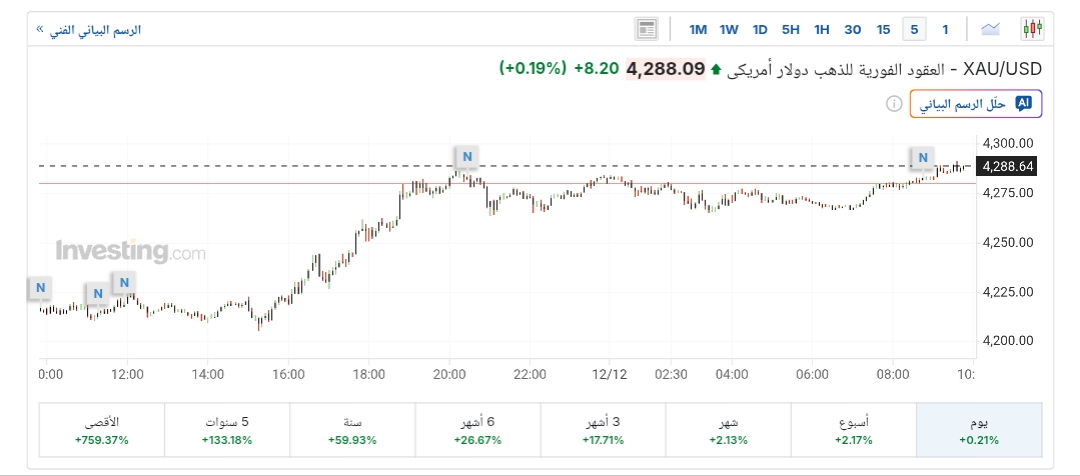 وافتتحت أونصة الذهب العالمي جلسة تداولات اليوم على ارتفاع طفيف بنسبة 0.1% لتتداول حاليًا عند 4,288 دولارًا للأوقية، بعد أن افتتحت تداولات اليوم عند المستوى 4279 دولار للأونصة، بحسب موقع «إنفيستينج».