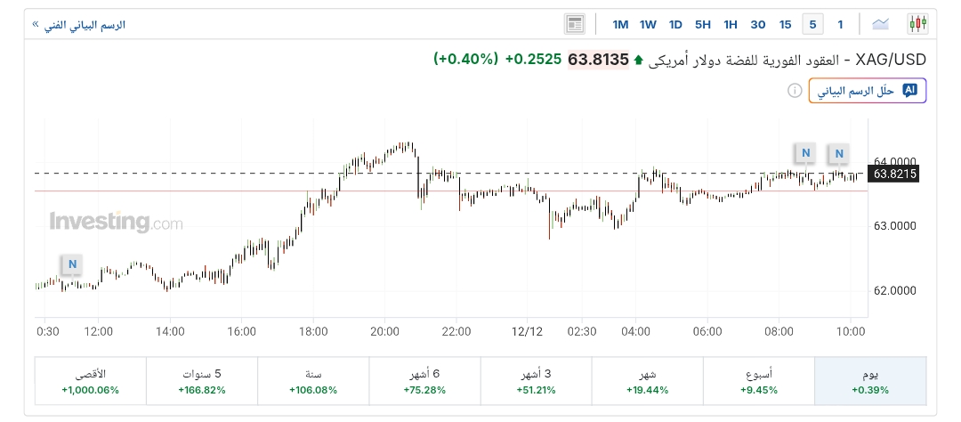 وعلى الصعيد العالمي، افتتحت العقود الفورية للفضة جلسة تداولات اليوم على ارتفاعٍ بنسبة 0.4% ليتخطى حاجز الـ63 دولارًا للأوقية، لتتداول الآن عند المستوى 63.81 دولارًا للأوقية، بعدما افتتحت التداولات عند المستوى 63.56 دولارًا، وفقًا لـ«إنفستينج».