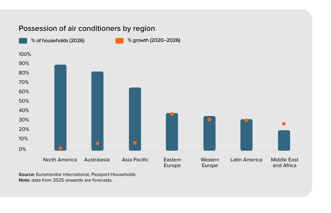 ونشرت شركة يورومونيتور إنترناشيونال، المتخصصة في أبحاث السوق، توقعاتها بالنسبة لعام 2026 في قطاع التكييفات، موضحة نسبة امتلاك البيوت الموجودة في العالم للتكييفات، حسب المناطق، وهو الموضح في الرسم السابق.