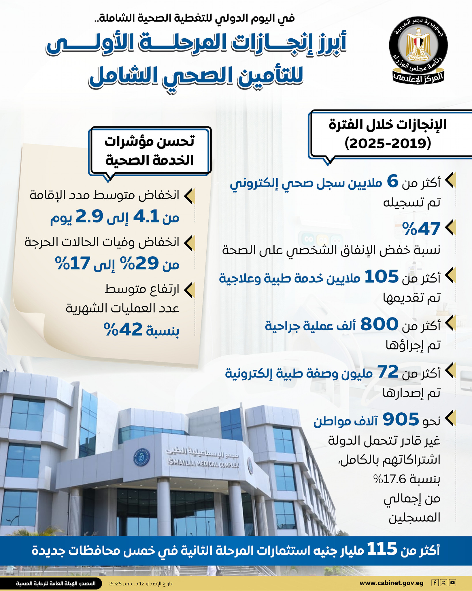 وأشار المركز، إلى أن إجمالي استثمارات المرحلة الثانية ضمن منظومة التأمين الصحي الشامل، بلغت لأكثر من 115 مليار جنيه في خمس محافظات جديدة، ملفةً إلى تحسن مؤشرات الخدمة الصحية إذ انخفض متوسط مدد الإقامة من 4.1 إلى 2.9 يوم، كما انخفضت وفيات الحالات الحرجة، من 29% إلى 17%، كما ارتفع متوسط عدد العمليات الشهرية بنسبة 42%.