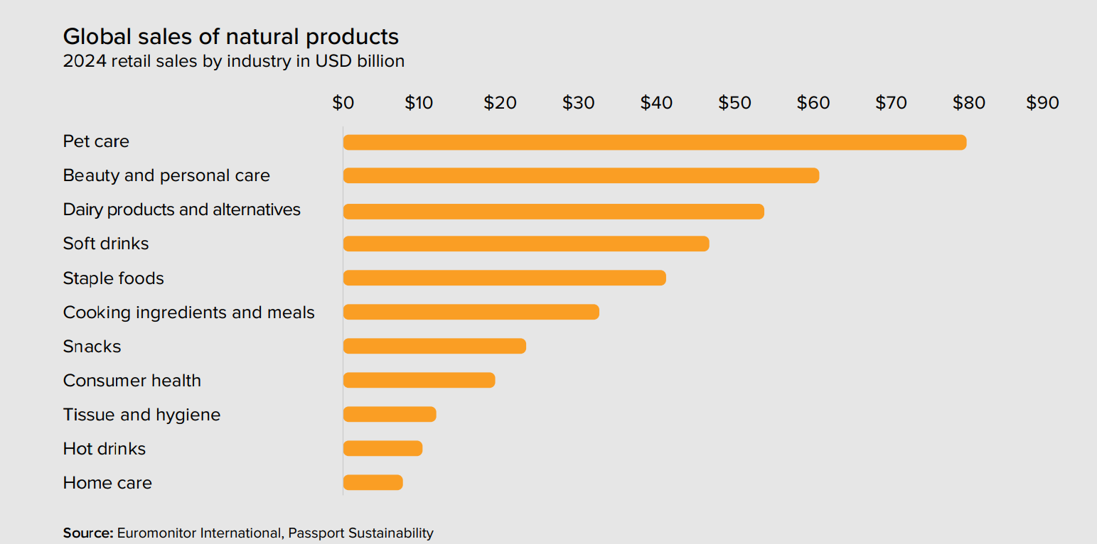 كانت أرقام المبيعات للمنتجات الطبيعية خلال العام السابق 2024، هي أكبر دليل على تفضيل المستهلكين للمنتجات الطبيعية، وفقًا لإحصائيات شركة يورومونيتور إنترناشيونال، المتخصصة في أبحاث السوق، تصدر قطاع رعاية الحيوانات الأليفة، قائمة القطاعات التي باعت منتجات طبيعية خلال العام السابق بحوالي 80 مليار دولار، تلاه قطاع الجمال والعناية الشخصية الذي حقق مبيعات تقريبية 60 مليار دولار، ثم قطاع منتجات الألبان والبدائل (الحليب - الأجبان - الزبادي - مشتقات الألبان - الحليب النباتي مثل حليب اللوز)، بمبيعات 52 مليار دولار.