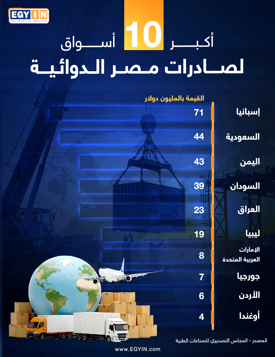 السعودية تبلغ قيمة الصادرات المصرية من الأدوية إلى السعودية نحو 44 مليون دولار، في حين تبلغ الصادرات المصرية من الأدوية إلى اليمن 43 مليون دولار.