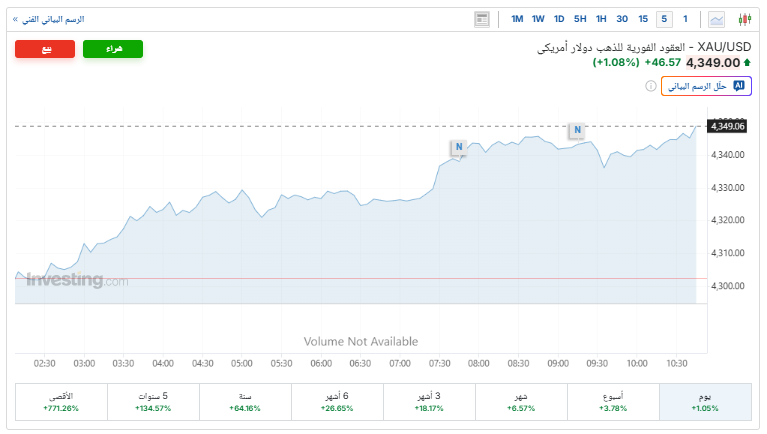 وارتفعت الأسعار الفورية للذهب بنسبة 1.05%، لتتداول حاليًا عند 4,339 دولار للأوقية، بعدما افتتحت التداولات عند 4,302 دولار، مسجلة أعلى مستوى لها عند 4,349 دولار، وأدنى مستوى عند 4,300 دولار، بحسب تقرير موقع «إنفيستينج».