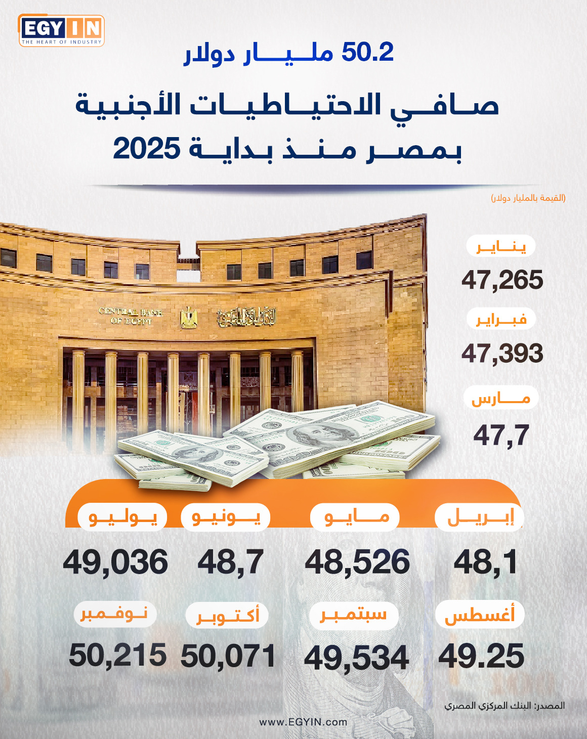 50.2 مليار دولار، صافي الاحتياطيات الأجنبية بمصر منذ بداية 2025 (إنفو جراف)