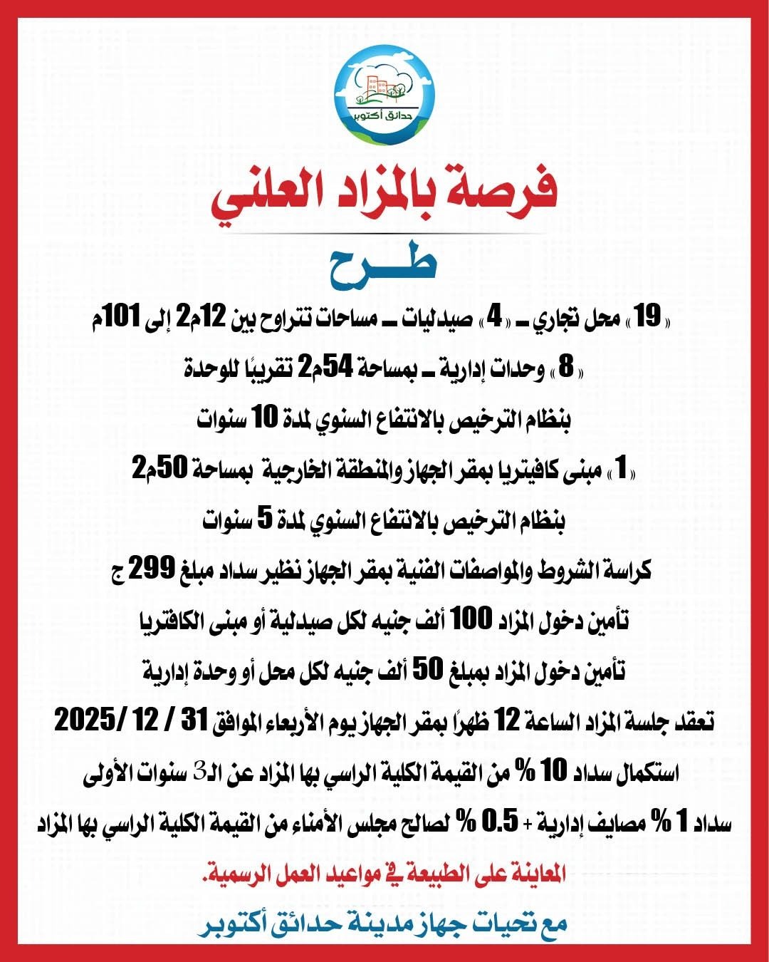 طرح جهاز مدينة حدائق أكتوبر، فرص استثمارية بالمزاد العلني علي 19 محلًا تجاريًا، و4 صيدليات، و8 وحدات إدارية بنظام الترخيص، بالانتفاع لمدة 10 سنوات.