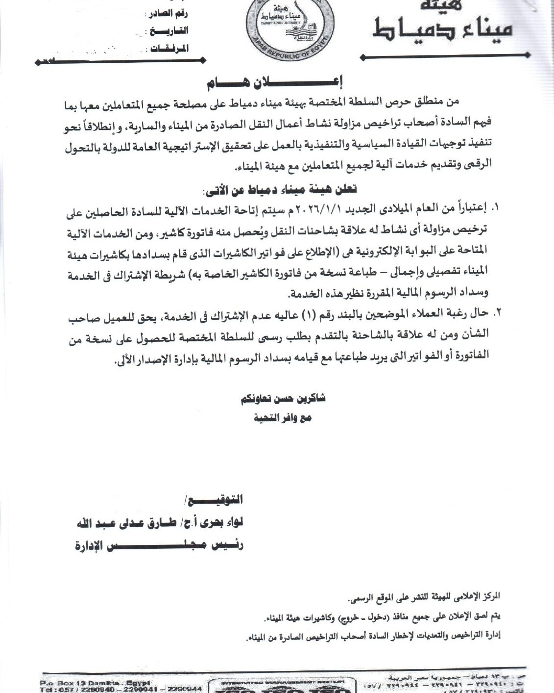 أعلنت هيئة ميناء دمياط، أنه اعتبارًا من العام الميلادي الجديد 1/1/2026 سيتم إتاحة الخدمات الآلية للحاصلين على ترخيص مزاولة أي نشاط له علاقة بشاحنات النقل، ومن الخدمات الآلية المتاحة على البوابة الإلكترونية هي الاطلاع على فواتير الكاشيرات الذي قام بسدادها بكاشيرات هيئة الميناء تفصيلي وإجمالي، وطباعة نسخة من فاتورة الكاشير الخاصة به شريطة الاشتراك في الخدمة، وسداد الرسوم المالية المقررة نظير هذه الخدمة.