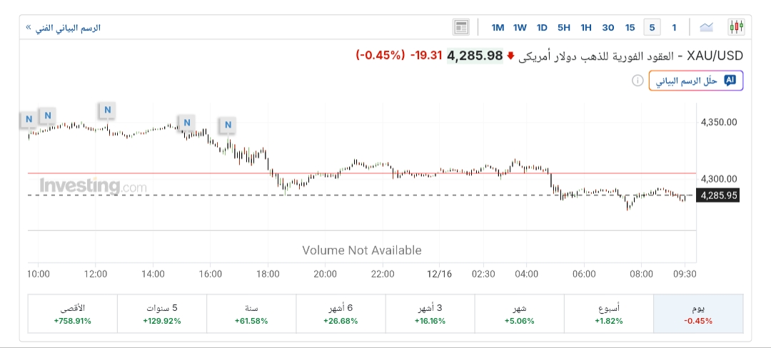 أسعار الذهب في بداية تعاملات اليوم الثلاثاء 16-12-2025