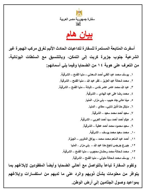 ومن ناحية أخرى أعلنت السفارة المصرية في بيان رسمي ليها أسماء 14 مواطنًا جرى التعرف على هوياتهم حتى الآن، وهم: