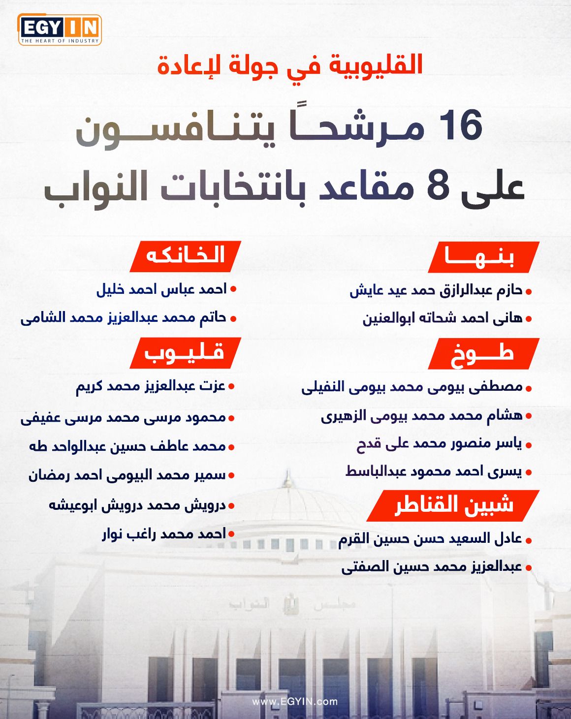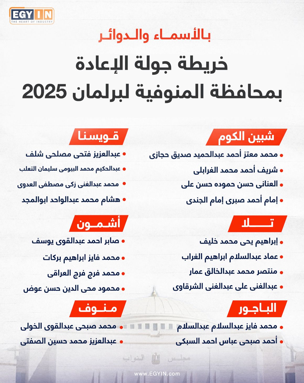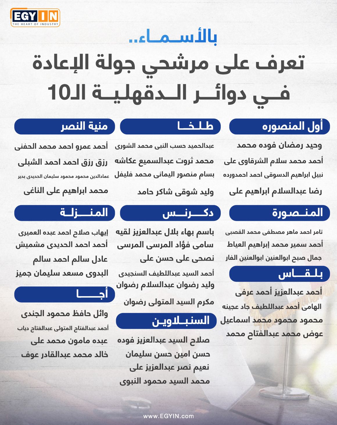 وينشر موقع «إيجي إن» أسماء الدوائر وأسماء المرشحين في الإعادة التي تنطق غدًا الأربعاء، وتستمر حتى الخميس 18 ديسمبر، وأسماء الدوائر والمرشحين في هذه الجولة جاءت علي النحو التالي:
