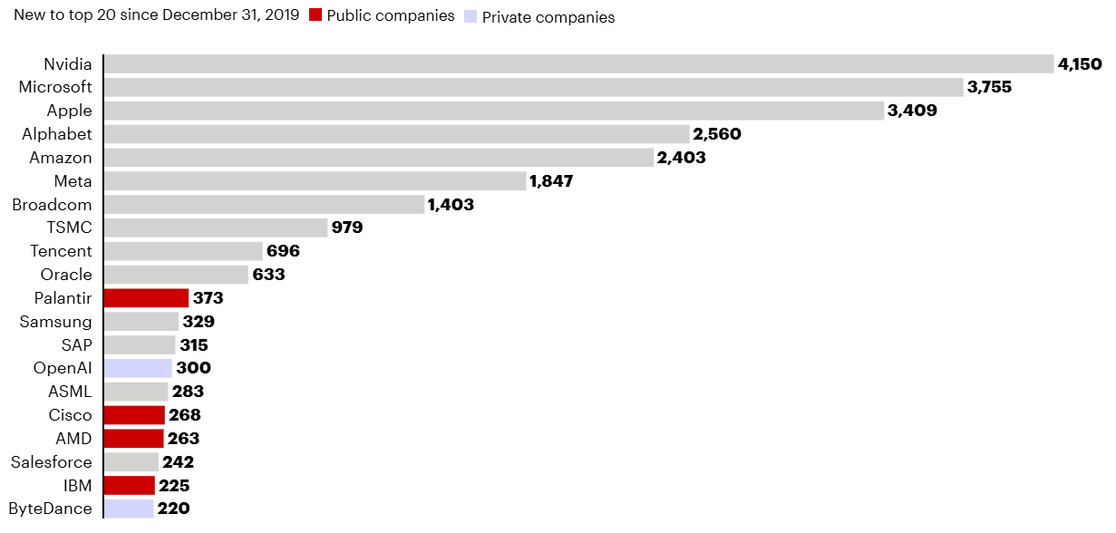 حتى الآن، تظهر الأرقام أن كبار اللاعبين هم المستفيد الأكبر، والشركات الخمس الأكبر تستحوذ على أكثر من 70% من القيمة السوقية لأكبر 20 شركة تقنية، مقارنة بـ65% فقط قبل عام.