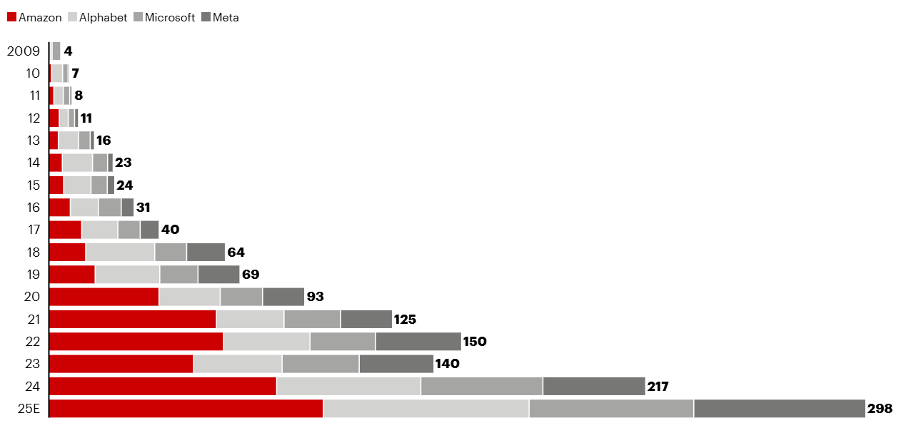 توضح الصورة المسار التصاعدي الحاد للاستثمارات الرأسمالية (Capex) لدى عمالقة التكنولوجيا الأربعة، Amazon وAlphabet وMicrosoft وMeta منذ عام 2009 وحتى التوقعات في 2025.