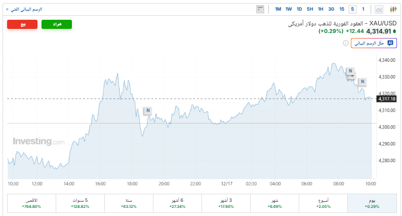 ارتفع سعر الذهب اليوم الأربعاء 17 ديسمبر 2025، مع صدور بيانات العمل الأمريكية الضعيفة التي أحيت التوقعات بتخفيض أسعار الفائدة، مما يضغط على الدولار ويعزز الطلب على المعادن النفيسة.