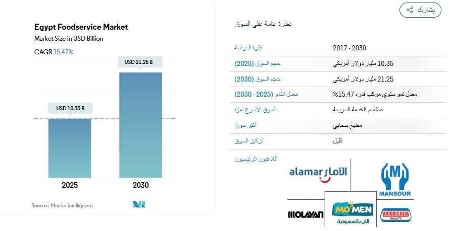 أصبح سوق المطاعم في مصر أحد أكثر الأسواق الحيوية والمرنة في الاقتصاد المصري، فبلغ حجم السوق 10.35 مليار دولار في 2025، ومن المتوقع أن يقفز لـ 21.25 مليار دولار في 2030، بمعدل نمو سنوي قوي 15.47% بحسب إحصائيات Mordor Intelligence.