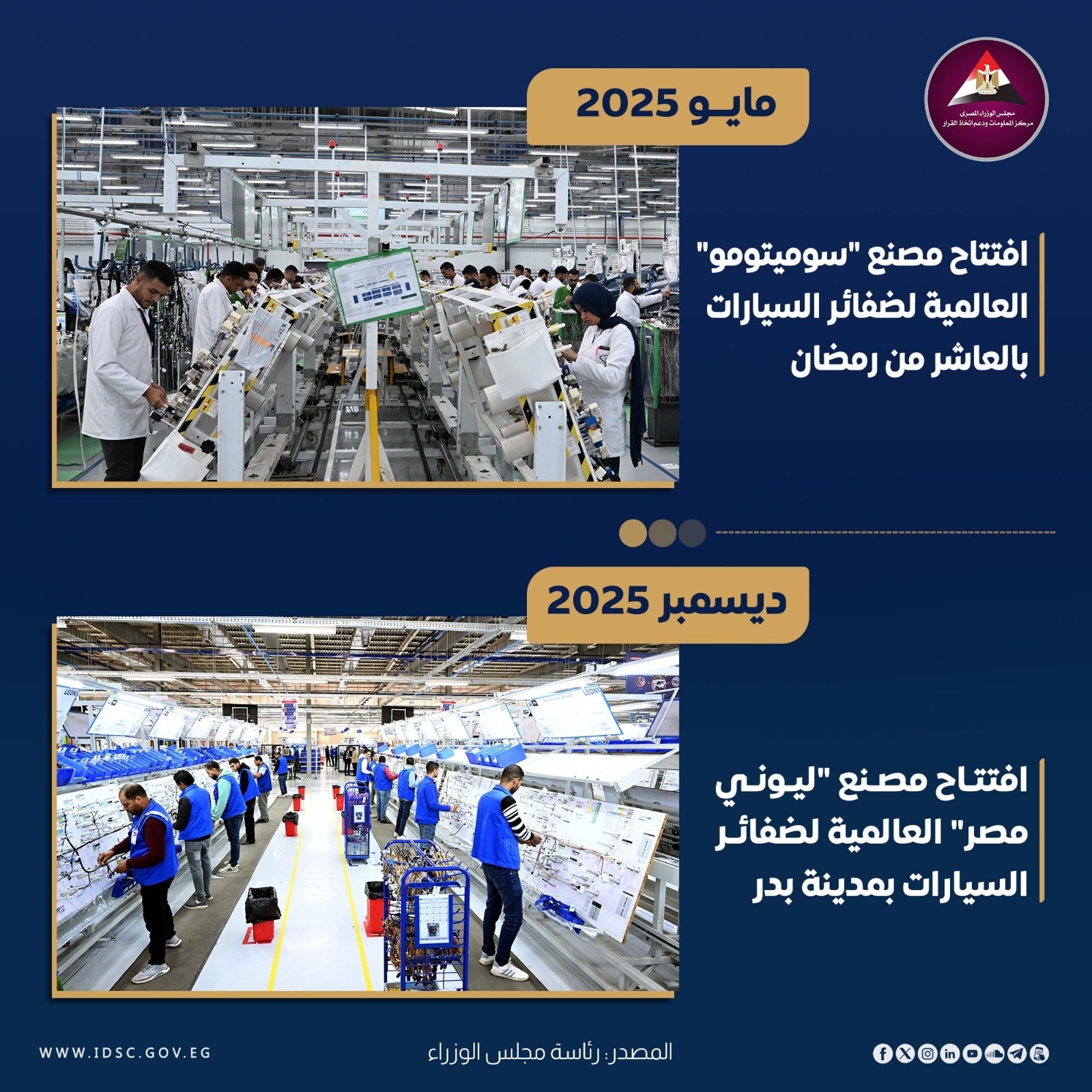 سلط مركز المعلومات ودعم اتخاذ القرار التابع لمجلس الوزراء، الضوء على صناعة السيارات وخاصة صناعة ضفائر السيارات، إذ تخوض "سوميتومو" اليابانية و"ليوني" الألمانية، تجربة جديدة في السوق المصرية، في خطوة تُعزز توجه الدولة نحو توطين الصناعات المغذية لصناعة السيارات، ففي مايو عام 2025، تم افتتاح مصنع "سوميتومو" العالمية لضفائر السيارات بالعاشر من رمضان.