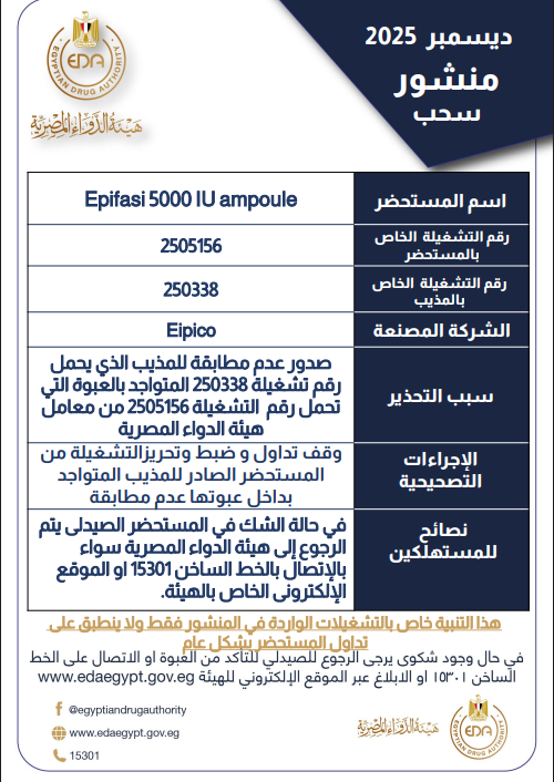 أصدرت هيئة الدواء المصرية، منشورًا يفيد بسحب Epifasi 5000 IU ampoule من تصنيع شركة إيبكو Eipico، الذي يستخدم في حالات قصور الغدد التناسلية الثانوي، وتحفيز الإباضة، والخصية المعلقة قبل البلوغ، وقررت الهيئة وقف تداول وضبط وتحريز المستحضر الحامل للتشغيلة رقم 250338، المتواجد بالعبوة التي تحمل رقم التشغيلة 2505156.