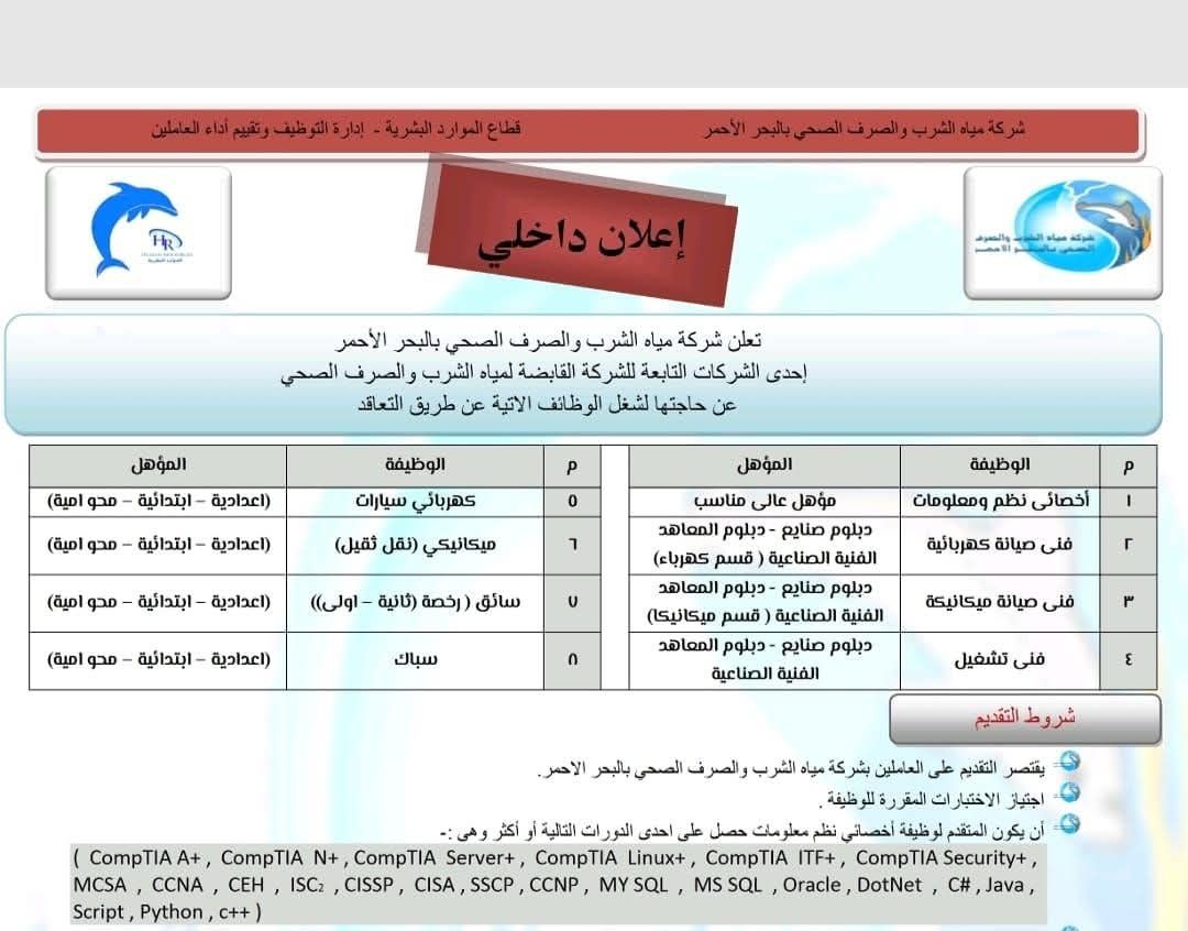 يسعى الكثير من الأشخاص، في الحصول على وظائف في شركات المياه، إذ إذ أعلنت شركة مياه الشرب والصرف الصحي بالبحر الأحمر إحدى الشركات التابعة للشركة القابضة لمياه الشرب والصرف الصحي، عن حاجتها لشغل الوظائف الآتية عن طريق التعاقد.