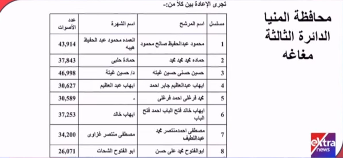 وفي الدائرة الرابعة ومقرها مركز أبو قرقاص، تقررت الإعادة بين السيد مجدي معتمد محمد سعداوي، وحازم فاروق طه عبد الله، وحسام محمود أحمد أحمد، ومصطفى محمد بهيدين أحمد التوني، وتشهد الدائرة الخامسة ومقرها مركز ملوي جولة إعادة بين عدد من المرشحين، على أن تُستكمل الإجراءات وفق الجدول الزمني الذي أعلنته الهيئة.