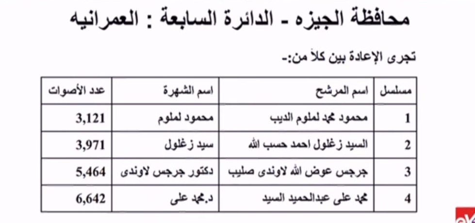 أما الدائرة العاشرة ومقرها قسم أول أكتوبر، فقد أعلن عن فوز المرشح أحمد حسين أحمد محمد حسين الشناوي، بينما تُجرى الإعادة بين أيمن أحمد حسين أبو العلة، وأحمد محمد علي محمد جبالي، وفي الدائرة الثانية بعاشر، ومقرها مركز منشأة القناطر، أُعلن فوز ياسر مشهور وأحمد عرفة، مع إجراء الإعادة بين محمد محمود عبد العزيز الديب، ومحمد عبد العزيز إبراهيم عفود، وناصر محمود السيد مألت.