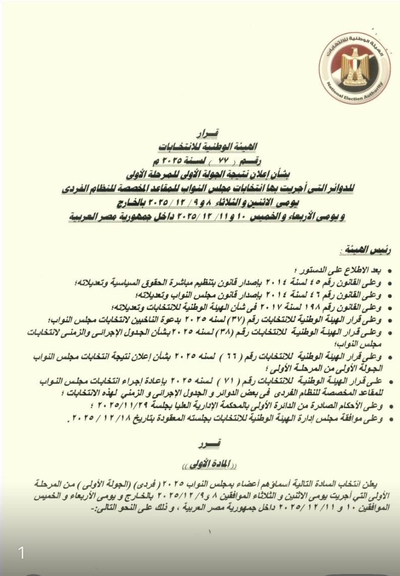 أعلنت الهيئة الوطنية للانتخابات برئاسة المستشار القاضي حازم بدوي، نتيجة الجولة الأولى من المرحلة الأولى التي أجريت بالخارج يومي الإثنين والثلاثاء الموافقين 8 و9 ديسمبر 2025، وداخل مصر يومي الأربعاء والخميس الموافقين 10 و11 ديسمبر 2025.