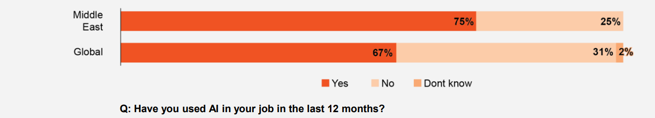 أظهرت أحدث الإحصائيات أن 32% من الموظفين في الشرق الأوسط يستخدمون الذكاء الاصطناعي التوليدي مثل ChatGPT وDALL-E في أعمالهم اليومية، مقارنة بالمتوسط العالمي الذي بلغ 28%.